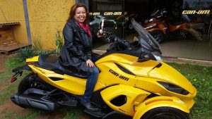 Piloto há 5 anos e hoje tenho uma spyder amarela. Antes de pilotar moto fui garupa e já viajei muito por ai. Sinônimo de mulher motociclista? Corajosa!