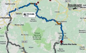 Foram quase 130 quilômetros, seguindo pela BR 381 sentido João Monlevade, em seguida entra na BR 262 para Caeté e segue passando por Barra Feliz, Brumal, Santa Bárbara, Catas Altas, Morro da Água Quente, e já na MG 129 na próxima entrada a esquerda, Santa Rita Durão.